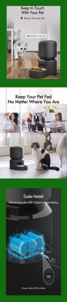 Freshness in Every Bite: Patented rotor on our auto cat food dispenser in the bottom of the tank and the secure twist-lock lid to keep pets from getting food. Built-in desiccant bag and the sealing strip, Granary auto feeder for cats uses triple seal lock the freshness to keep food fresh and crunchy. Easy to Set up and Program: PETLIBRO timed cat feeder can set 1-6 meals daily and up to 50 portions per meal (20ml each portion). Use the easy-to-read tilt LED panel to adjust your pet’s feeding schedule and monitor battery power. The Granary auto cat feeder is also equipped with a manual feeding button to easily reward your pet (up to 5 portions). Dual Power Supply: Easily monitor the pet food level through the transparent window and replenish food in time. Besides the USB-C adapter, the automatic dog feeder can also use 3 alkaline D batteries (not included) as a backup power source to ensure that it can be used even if the power goes out, giving you peace of mind when feeding your furry friend. Personalized Meal Call: Stay close to your pet even if you’re not at home. PETLIBRO Automatic pet feeder can record a 10-second message, and the number of recordings played can be individually set from 0-5 times, so your pet won’t disturb your sleep while your pet is eating in the middle of the night. BPA-free and Easy to Clean: For your pet’s health, PETLIBRO cat automatic feeders and accessories are BPA-free. The tank lid, tank, tank base, and food bowl of Granary auto cat feeder are removable for thorough cleaning. And the built-in infrared sensor in the food outlet can stop dispensing food when the food outlet is blocked.